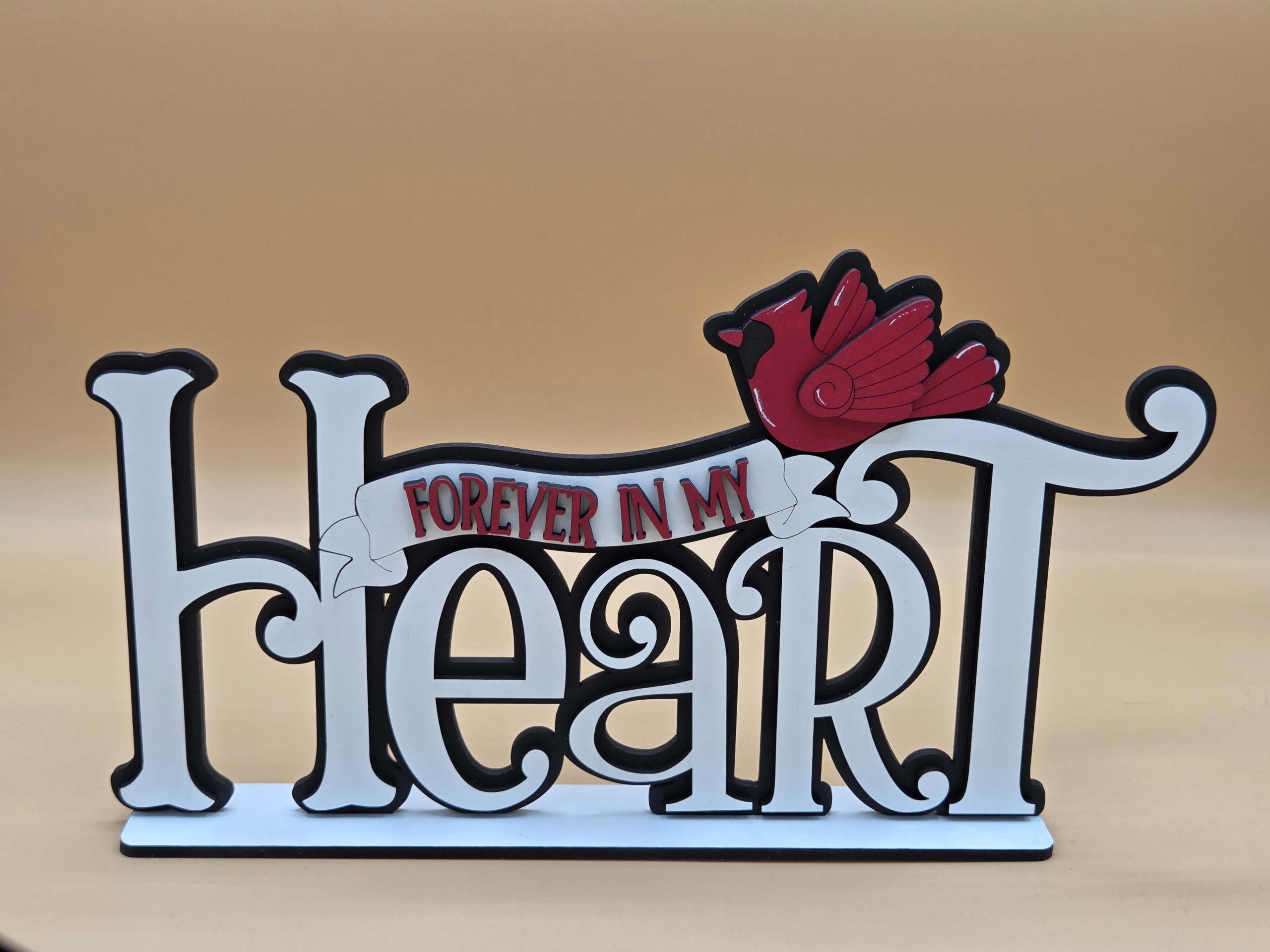 Honor the memory of a loved one with this beautifully crafted Cardinal‑themed shelf sitter. Made from durable 1/8" MDF and precision‑cut for clean detail, this piece features a touching “Forever in My Heart” message paired with the timeless symbolism of the cardinal. Measuring 10 3/8" wide by 5 3/4" high, it fits perfectly on mantels, bookshelves, tiered trays, and memorial displays.
