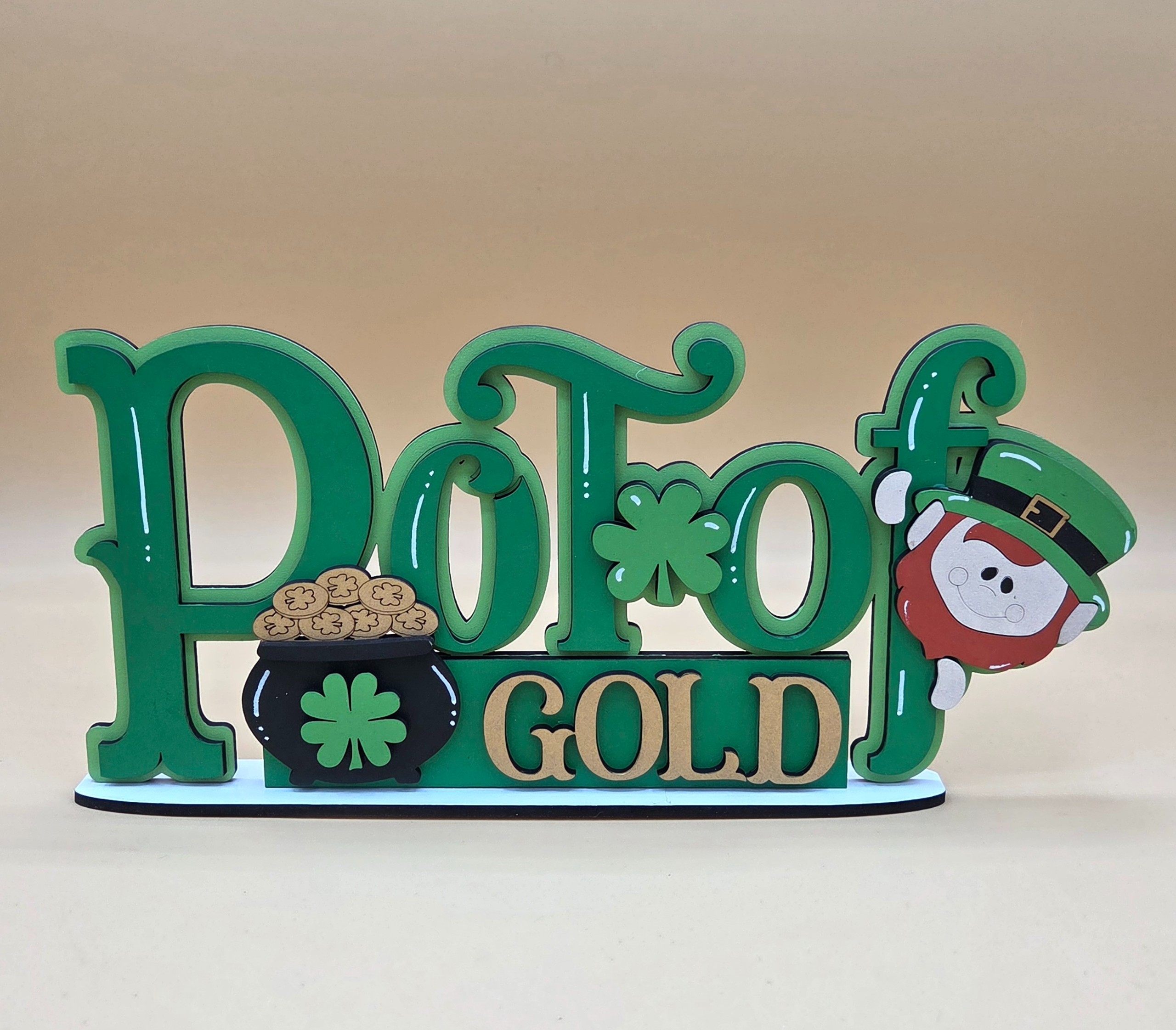 Bring a touch of Irish charm into your home with this beautifully crafted St. Patrick’s Day shelf sitter. Made from durable 1/8″ MDF and precision‑cut for crisp detail, this piece adds a fun, festive accent to mantels, tiered trays, bookshelves, and holiday displays. Measuring 10 3/4″ wide by 5″ high, it’s the perfect size for celebrating the season or gifting to someone who loves all things lucky and green.
