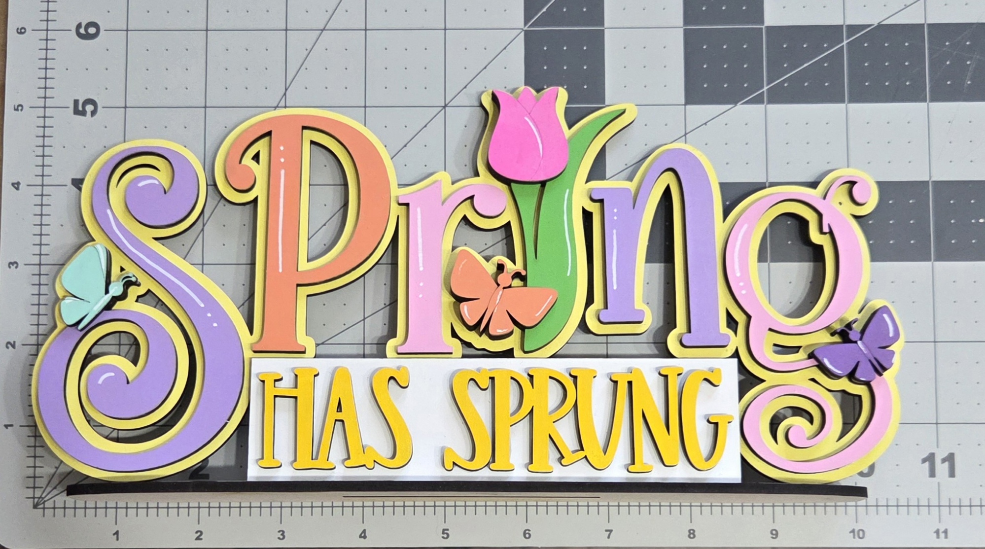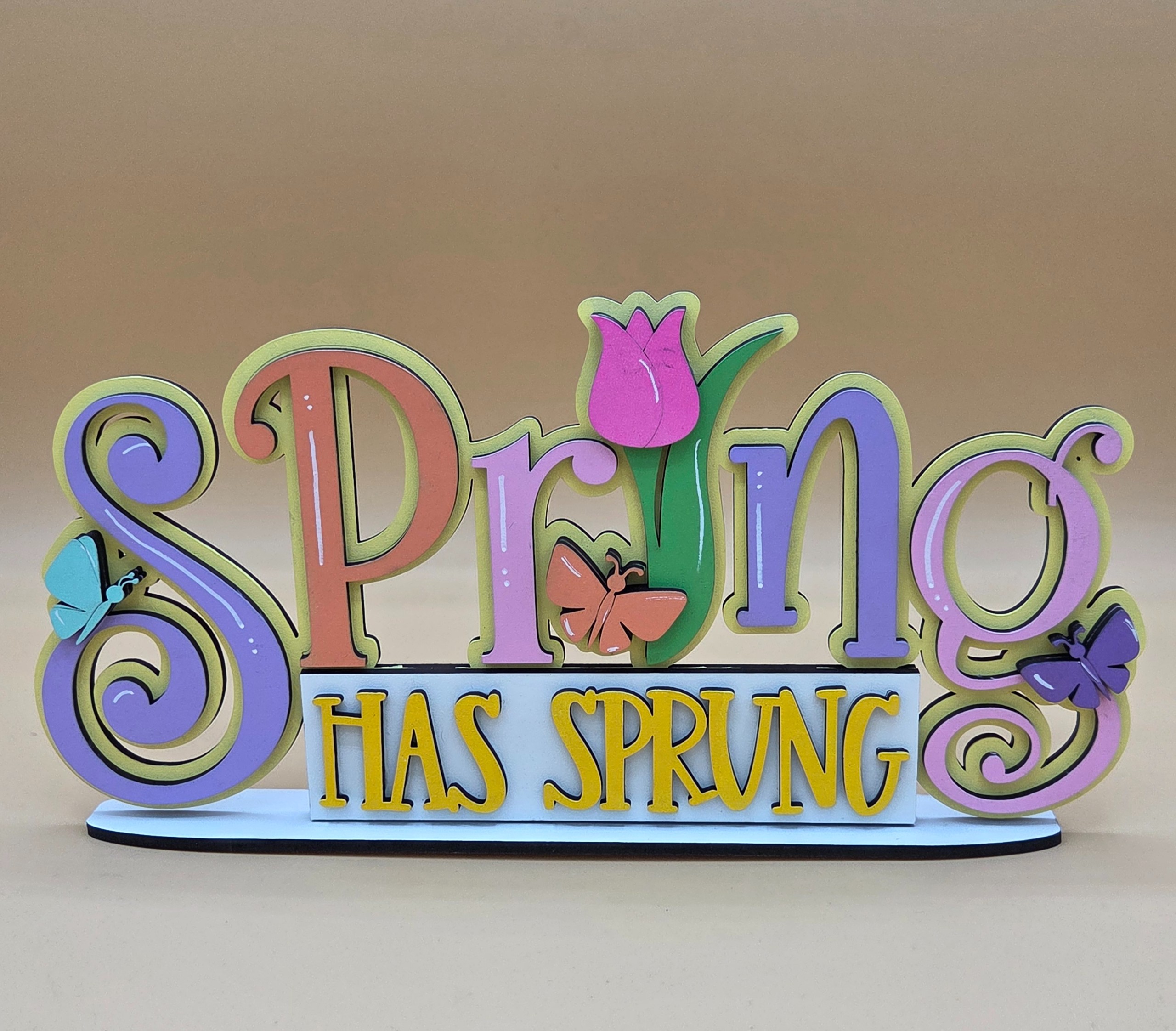 Bring the warmth and renewal of the season into your home with this beautifully crafted spring shelf sitter. Made from durable 1/8″ MDF and precision‑cut for crisp detail, this piece adds a bright, uplifting touch to mantels, tiered trays, bookshelves, and spring displays. Measuring 10 1/2″ wide by 5 1/4″ high, it’s the perfect size for refreshing your décor or gifting for the season.