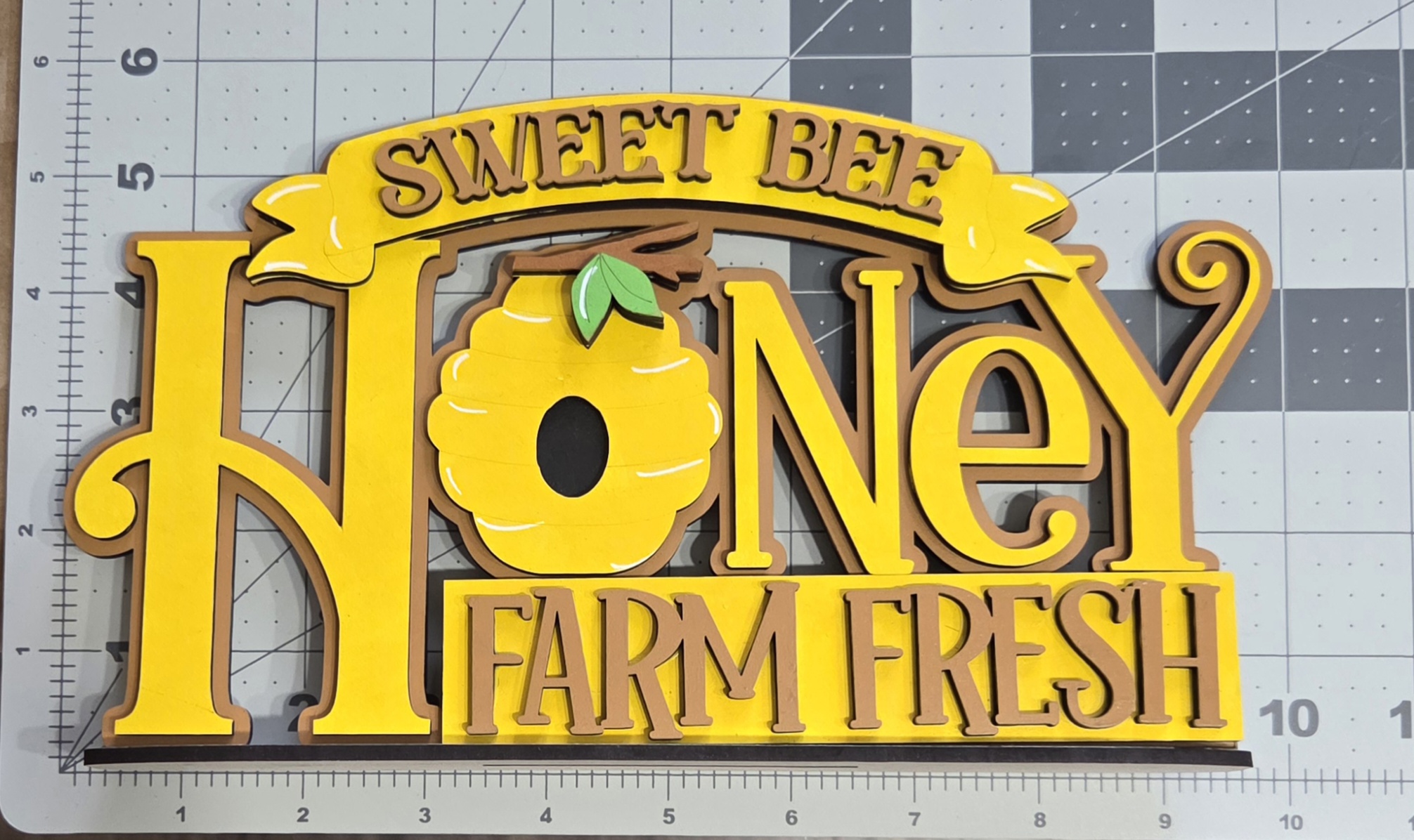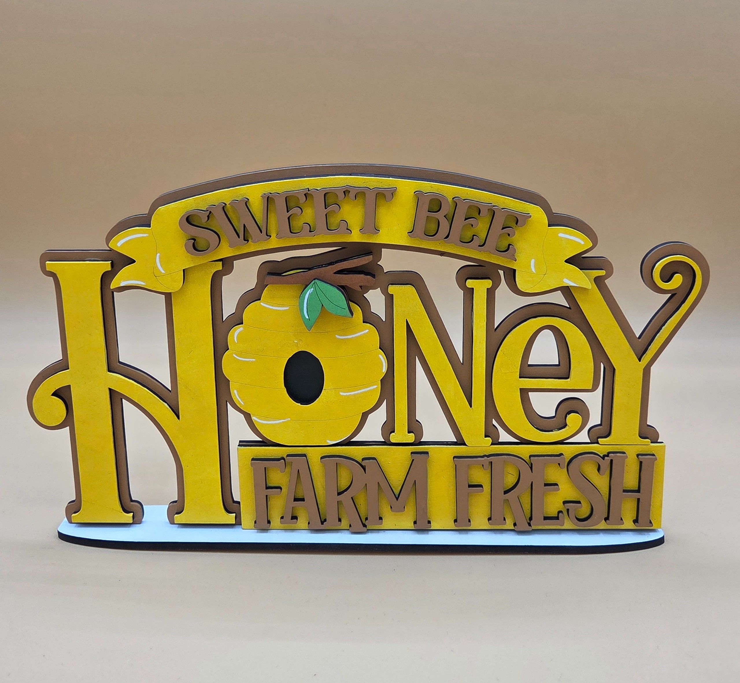 Bring a touch of sweetness and whimsy into your home with this beautifully crafted bee and honey‑themed shelf sitter. Made from durable 1/8″ MDF and precision‑cut for crisp detail, this piece adds a bright, nature‑inspired accent to mantels, tiered trays, bookshelves, and seasonal displays. Measuring 10″ wide by 5 1/2″ high, it’s the perfect size for spring and summer décor or gifting to any bee lover.